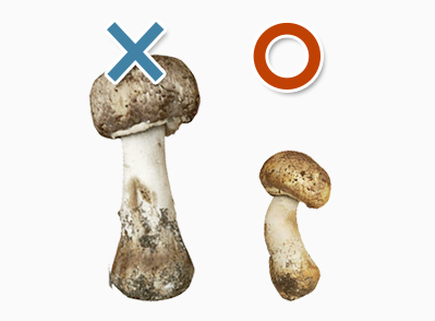 大きなヒメマツタケと小さなヒメマツタケがあった時、あなたはどちらのヒメマツタケを選びますか? 多くの人が大きな方を選んでしまいがちですが、キノコは「育ちきる直前」が1番良い状態なのです。 特にキノコ類は、繁殖の為に胞子を飛ばします。 この胞子は、傘が開くことで拡散します。 つまり、傘が開く前というのは、拡散する為のエネルギーを蓄えている状態なのです。 日本食菌工業では、一番良い状態のヒメマツタケを収穫し、原料を作っています。