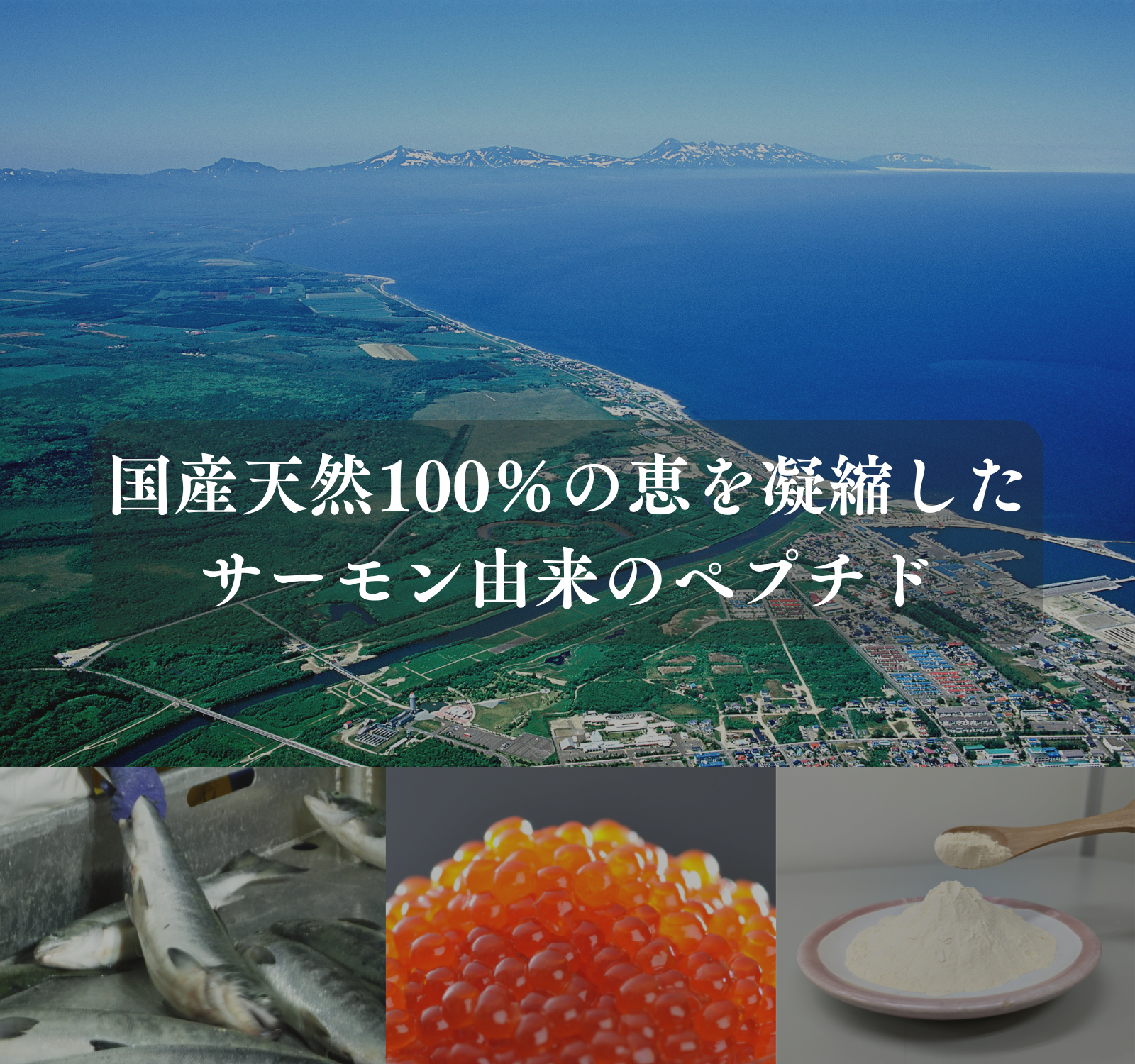 サケ目サケ科の卵巣外皮(イクラを作ったときに残るヒモ状の筋)を酵素で加水分解後、抽出して得られたペプチドのフリーズドライ品です。